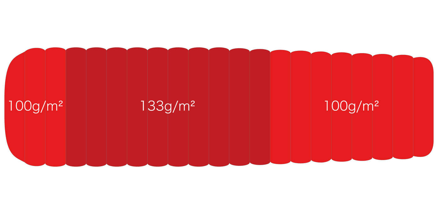 マット内にライニングされているPrimaLoftを場所によって異なる厚みを使用することで、より効率的に断熱することが出来ます。